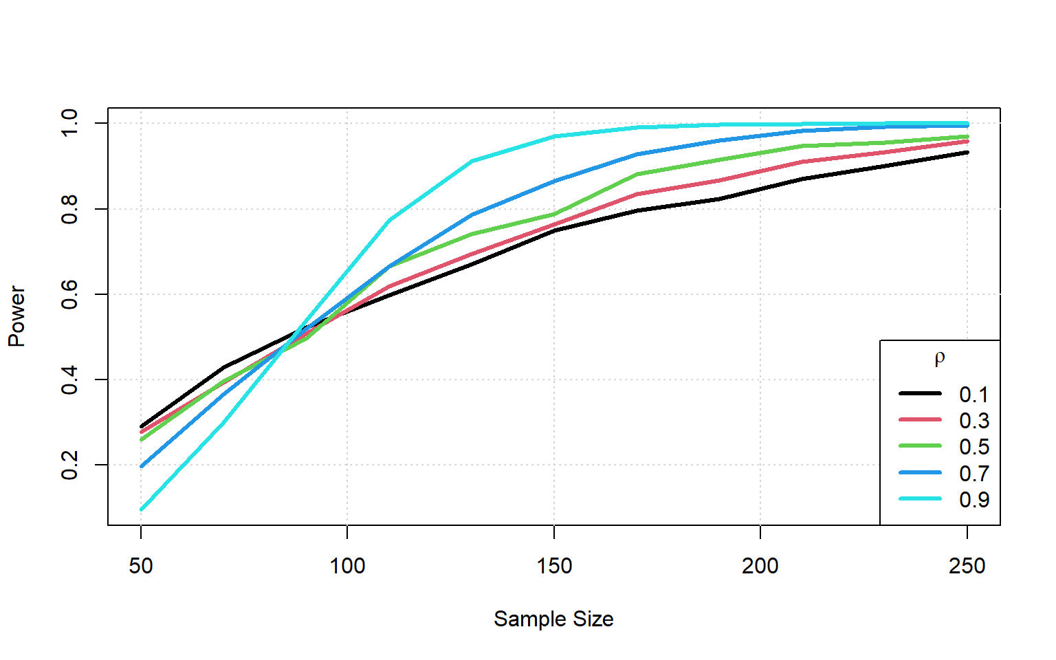 We note that only as the correlation approaches 1 (unrealistic) do we approach the same power we had as with the paired data. Paired data is more powerful.